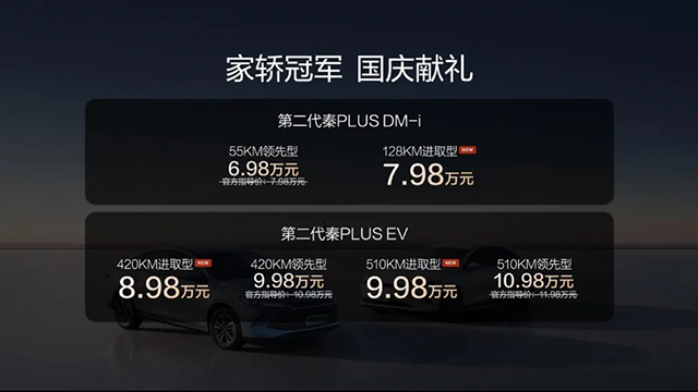 9月26日,比亚迪宣布:第二代秦PLUS部分版本车型“限时降价”1万元,包括DM-i 55km领先型、EV 420km/510km版本。这是官方层面直接做降价动作,不是经销商贴补或折扣玩法。