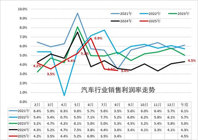 监管层的担忧并非空穴来风。根据行业报告,今年1–8月汽车行业整体利润率仅4.5%,8月更进一步跌到3.4%。很多中小品牌本就资金紧张,若行业价格战长期化,生存将难以为继。