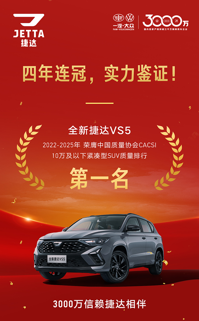 在由中国质量协会发布的汽车用户满意度测评(CACSI)中,捷达VS5自2022年起连续四年荣获“10万及以下紧凑型SUV”用户满意度第一名,彰显了其卓越的产品力;同时,捷达VA3和VS7等车型也多次在各自细分市场获得用户满意度第一,成为了520万车主奋斗路上最忠实的伙伴。它见证了中国汽车市场的蓬勃发展,也参与了中国普通家庭从“拥有一辆车”到“享受有车生活”的时代变迁。正是这一份份沉甸甸的信赖,共同构筑了一汽-大众迈向3000万辆殿堂的坚实基石。