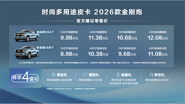 10月22日,时尚多用途皮卡——2026款金刚炮在荆门智慧工厂焕新上市。金刚炮8AT车型,售价9.98万元起;金刚炮6MT车型,售价8.98万元起。