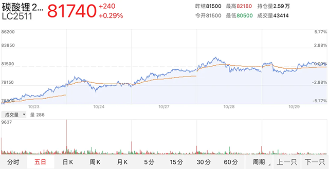 10月29日,广州期货交易所碳酸锂LC2511上涨0.29%,收于81740元/吨。