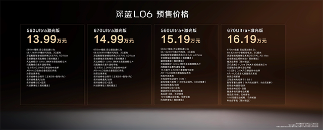 深蓝L06已正式开启预售。新车共推出四款配置车型:560Ultra激光版预售价13.99万元、670Ultra激光版预售价14.99万元、560Ultra+激光版预售价15.19万元、670Ultra+激光版预售价16.19万元,预售权益至高可享价值80259元。