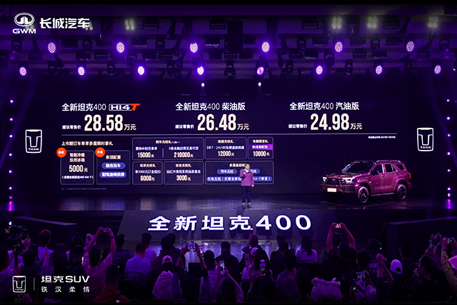 日前,全新坦克400正式上市,新车共推出五个版本,售价24.98万元起。