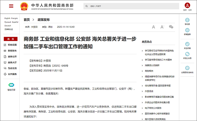 11月14日,商务部、工信部、公安部和海关总署联合发布了《关于进一步加强二手车出口管理工作的通知》。