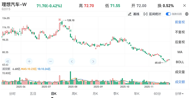 理想汽车H股11月26日收跌0.42%,报71.70港元。今年6月份以来,除9月小幅反弹外,其余5个月均下跌。股价自今年2月高点138.30港元跌至11月21日的68.40港元,累计跌幅超过50%,市值蒸发约1500亿港元。