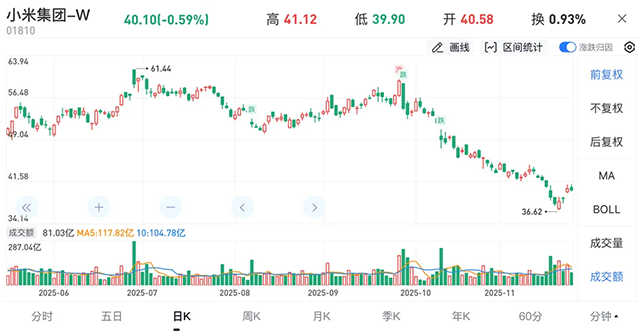 小米集团H股11月26日收跌0.59%,报40.10港元。股价自今年6月高点61.45港元一路下滑至11月21日的36.62港元,累计跌幅达40%,市值蒸发超过6400亿港元。