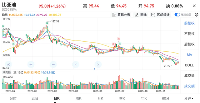 比亚迪A股11月26日收盘95.09元,11月份累计下跌5.66%。今年4月至今,除8月短暂反弹外,其余7个月均呈下跌态势。股价从5月23日的年内高点137.67元回落至11月21日低点91.70元,累计跌幅超过33%,市值蒸发约4100亿元。