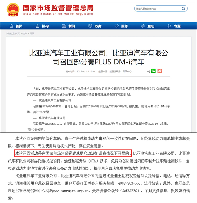 11月28日,国家市场监督管理总局发布一则召回公告:比亚迪秦PLUS DM-i因电池包缺陷,将召回88981辆。