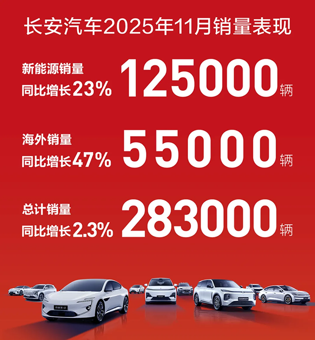 在2025年国内乘用车市场同比下滑6%的调整期,长安汽车逆势跑出增长“加速度”:1-11月累计销量达265.8万辆,同比增长9.25%;新能源销量99.5万辆,同比激增54.66%,即将突破百万大关;海外销量58.4万辆,持续领跑自主品牌,成为拉动整体增长的重要引擎。