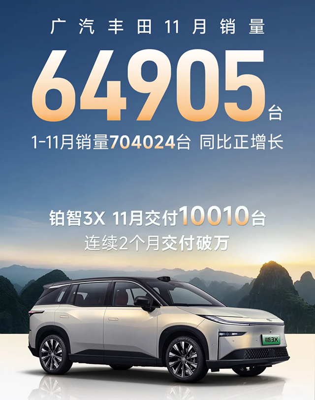 作为首个提出“油电同强”的合资车企,广汽丰田在2025年已经初尝双线作战的甜头。截至11月,广汽丰田销量超过70万辆。其中,新能源车在铂智3X热销的带动下,占比正在扩大。这款电动车的月销量已经连续两个月超过万辆,成为合资电车销量最高的车型之一。