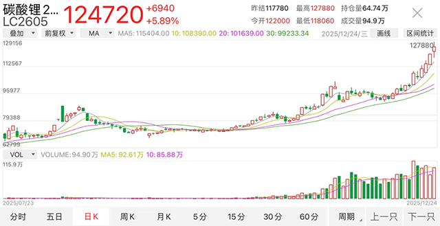 12月下旬以来,碳酸锂期货LC2605连续放量上攻,15日突破10万元/吨,19日突破11万元/吨,23日一举攻破12万元/吨。该期货品种自挂牌以来从未出现过如此疯狂的行情。