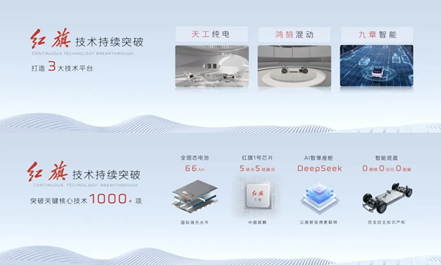 随着“天工”纯电、“鸿鹄”混动、“九章”智能三大平台的全面落地,自主研发的5纳米“红旗1号”芯片、66Ah全固态电芯(主要指标国际领先)、900V高压平台等核心技术的逐步量产应用,红旗的新能源产品谱系从2025年开始大幅提速。