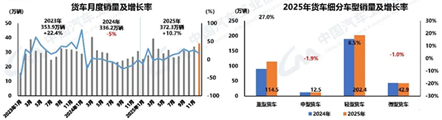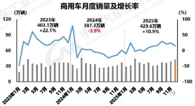 2025年,商用车产销分别为426.1万辆和429.6万辆,同比分别增长12%和10.9%。产销规模重回400万辆,说明商用车市场逐步回暖,抗压增强,超过年初预期。