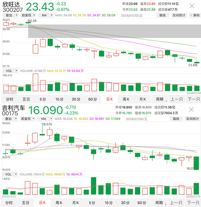 受该消息影响,欣旺达A股次日开盘即跳水,收盘大跌11.39%,单日市值损失62.6亿元。截至1月30日收盘,欣旺达累计跌幅21.2%,一个多月市值累计蒸发了118.5亿元。同期,吉利汽车股价从16.92港元跌至16.09港元,累计跌幅4.9%。