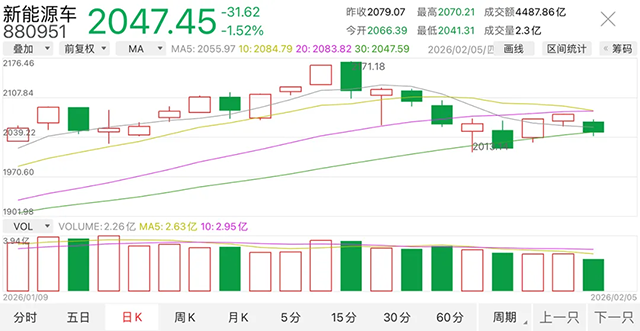 2月5日,A股新能源车板块下跌1.52%,港股新能源车板块下跌0.37%,这一轮调整已持续四个多月。板块整体走弱之下,龙头个股的回落更为明显。