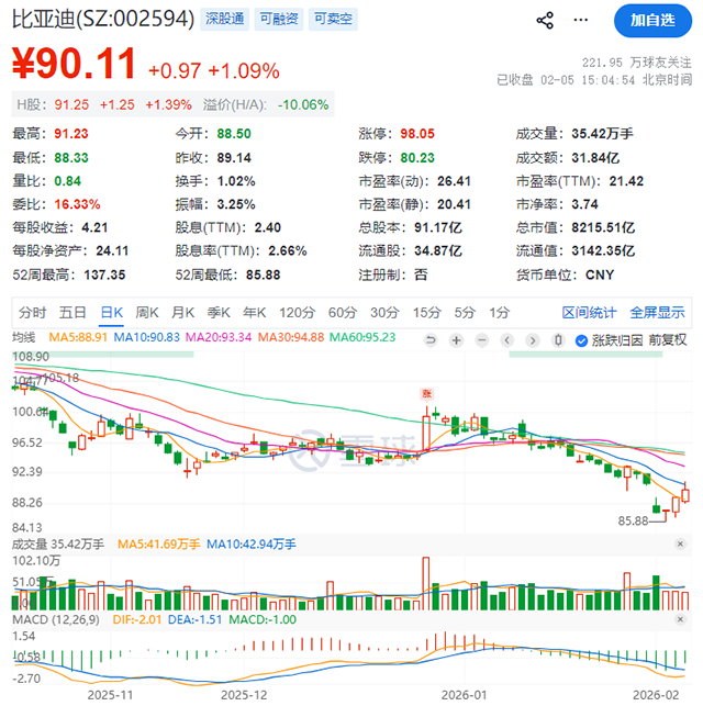 比亚迪A股2月5日收于90.11元,市值8215.51元。从去年5月23日137.67元的高点算起,最低跌至今年2月3日的85.88元,累计跌幅37.6%,市值减少约4715亿元。