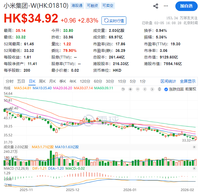小米集团当日盘中一度下探至33.32港元,为一年多来的新低,收盘报34.92港元,市值9129.6亿港元。相比去年6月61.45港元的高点,最大跌幅达到45.7%,股价几近腰斩,月线已连续五个月收阴,市值蒸发超7300亿港元。