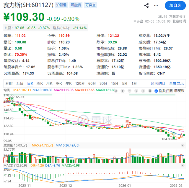 赛力斯这只曾经的人气股也难逃回调,当日下跌0.90%,收于109.3元,市值1903.99亿元。四个多月内,其股价自174元回落至百元出头,累计跌幅已超四成,市值蒸发约1200亿元。