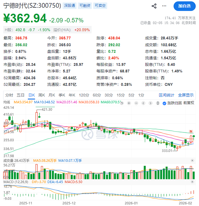 宁德时代同样承压,当日下跌0.57%,收于362.94元,市值1.66万亿元。与去年10月424.36元的阶段高点相比,累计跌幅超20%,市值缩水约4000亿元。