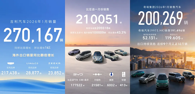 2026年1月,吉利销量27.02万辆,同比微增1%;比亚迪销量21.01万辆,同比下降30.1%,跑输大市;紧随其后的奇瑞销量20.03万辆,同比下降10.7%,与比亚迪差距不足万辆。