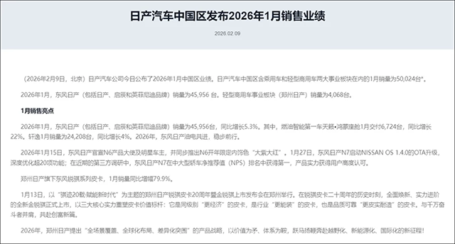 2026年1月,国内汽车市场走势偏弱,日产中国却交出了一份超出预期的销量数据:全品牌销售50024辆,同比增长10.14%,其中东风日产贡献45956辆,同比增长5.35%;郑州日产商用车板块也同步实现增长,成为销量回暖的支撑。