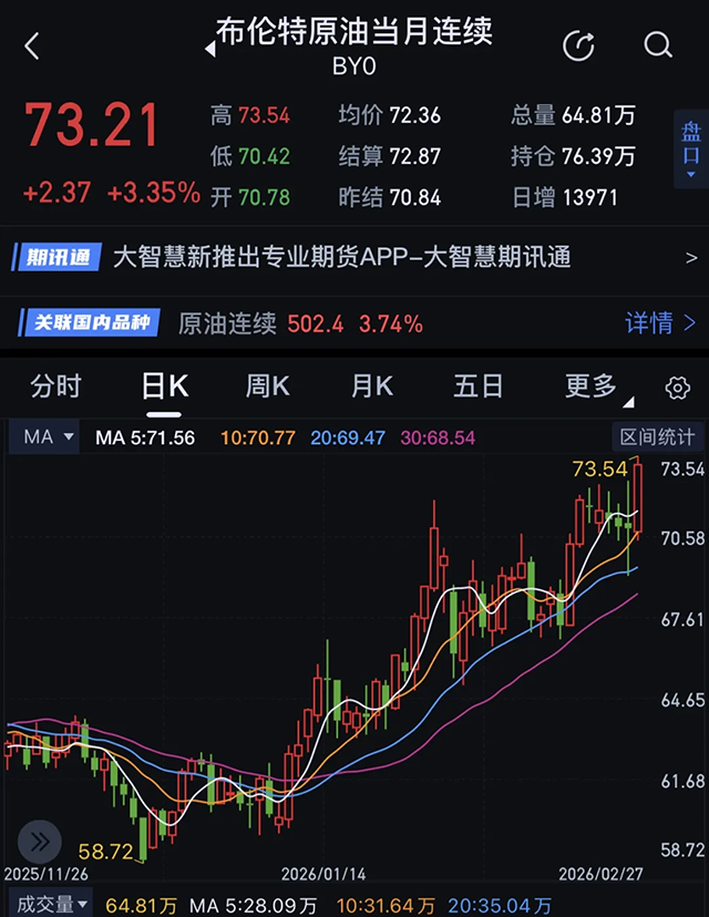 截至2026年3月1日17时,NYMEX原油价格已突破72美元/桶(较2月28日收盘价上涨约7.3%),受霍尔木兹海峡关闭、地缘冲突升级影响,油价呈快速上行趋势,后续走势直接取决于冲突是否进一步扩散至其他中东产油国。