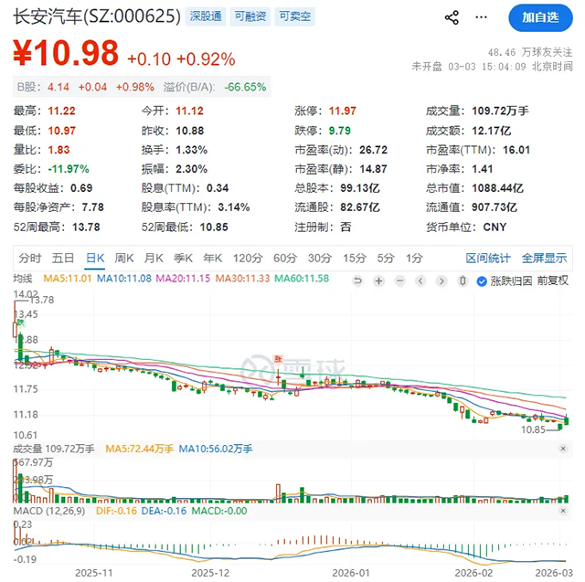 公告次日,长安汽车A股收盘价10.98元,与回购上限存在明显差距。长安汽车在行业内卷激烈、股价阶段性调整的节点推出方案是出于明确的长期判断。