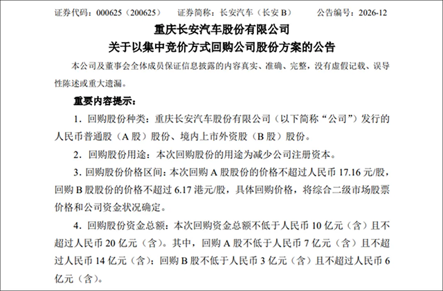 此外,方案同时覆盖A股与B股。长安B股长期处于低估值状态,市净率低于0.5倍,流动性低。公司专门安排3亿至6亿元额度回购B股,兼顾两类股东利益,也在修复境外投资者对公司价值的认知。