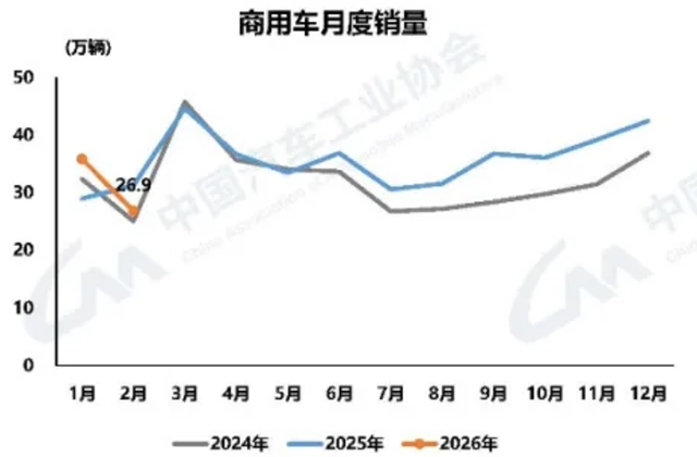 2月,商用车产销分别完成27.3万辆和26.9万辆,环比分别下降29.7%和24.9%,同比分别下降14.1%和14.0%。
