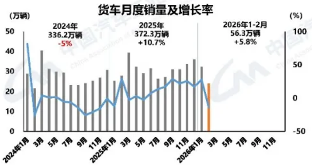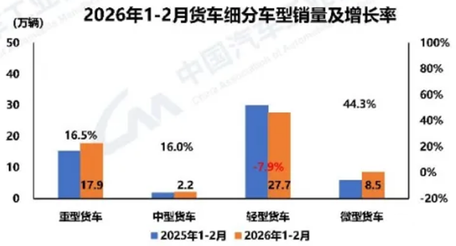 2月货车市场产销分别完成24.5万辆和24.0万辆,环比分别下降30.1%和25.7%,同比分别下降12.9%和13.9%,占商用车总销量的89.2%,仍是行业绝对主力。