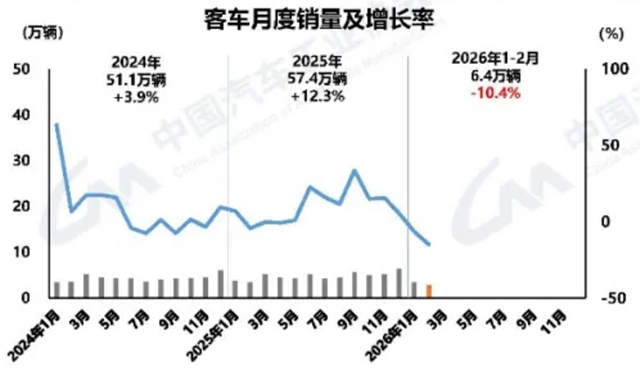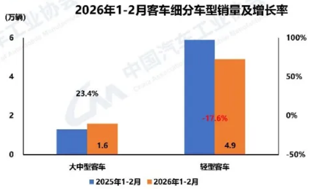 1-2月,客车累计销量6.4万辆,同比下降10.4%,其中大中型客车累计销量1.6万辆,同比增长23.4%,结构向高端、大型化倾斜。