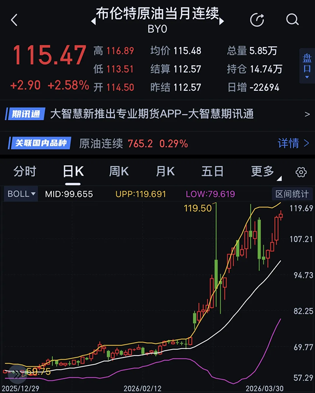 此次美以伊局势升级,大幅推高了国际油价。2026年3月,布伦特原油从75美元/桶一路飙升至114美元/桶,涨幅达52%;WTI等原油价格同步上涨。