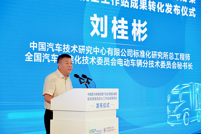 第三项议程,由嘉宾代表发言。首先由中汽中心标准所总工程师刘桂彬先生讲话。刘先生表示,作为负责汽车标准化工作的总工程师,近两年在重卡换电的行业标准工作中,他能够切实感受到欧阳院士工作站的方案暨宜宾方案,已经快速融入到国家标准的方案中。他希望宜宾的成果,不仅能够成为国家标准,也能够引领世界标准。