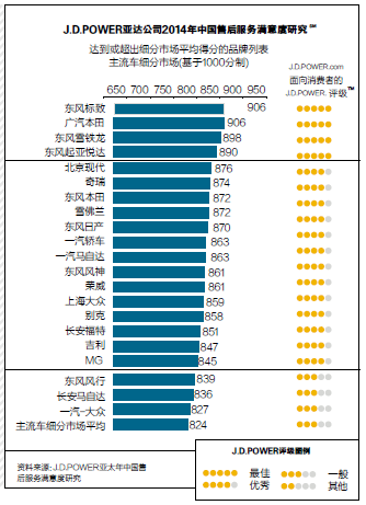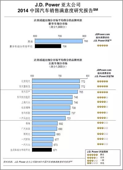 以较为公允的数据:J.D.POWER2014年中国汽车销售满意度研究报告中,一汽-大众的销售满意度仅排名第十三位,不仅排在南方上海大众之后,甚至排名在奇瑞、一汽轿车这两个国产品牌之后,得分仅673分,与第一名北京现代(772分)有近100分之差。而在售后满意度调查中,一汽-大众则更加靠后,排名在20名之外。这两个数据,显然与其全年第一的销售地位极不匹配。