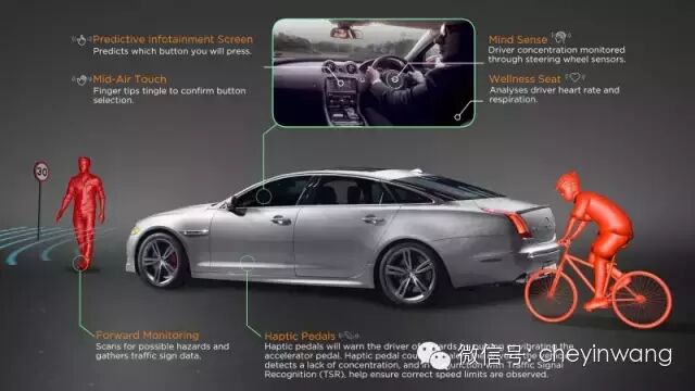 这一技术的依据听上去很简单。捷豹路虎研究与技术总监Wolfgang Epple博士介绍,驾驶员在用手操作信息娱乐系统时,眼睛会不由自主地盯住中控屏或者仪表盘,而这也正是研究的入手点——研究人员希望减少司机视线离开前方的时间,并让司机的双手尽可能少地离开方向盘。为了实现这一目的,捷豹路虎推出了“预测式信息娱乐屏幕”的原型机。 通过内嵌摄像头,屏幕可以捕捉驾驶者手部运动轨迹,系统借此就可以预测驾驶者将要使用哪一个按钮。这也就意味着,用户的手无需与屏幕接触,就可以完成操作。根据实测,通过此方式,用户的操作速度提升了22%,目光离开路面的时间也相应减少了。 看上去,捷豹的这个系统和大众、奥迪、宝马的手势操作也没什么区别嘛……别急,还得接着讲。我们都知道,触屏哪儿都好,唯一不如按钮的就是物理反馈。用户在把手指按上去的时候,往往少了一种安稳感。包括大陆等零部件厂商,也都在研究带震动反馈的触屏。反馈的问题,回到手势操作,会不会更严重? 捷豹路虎告诉我们——没屏幕照样震得爽。据介绍,技术人员采用了超声波的方式,在用户成功完成操作时,给予悬在空中的指尖一个震动刺激。用户可能感到指尖按到了一个什么东西,或者感到了一个震动波。由于神经传导速度非常快,指尖的触觉会瞬间传递到大脑,用户无需通过目视确认操作结果,目光也就能持续地停留在路面上了。 别忙,除了手势操作还有好玩的。除了“看手相”,捷豹路虎还要“读心”,看看驾驶者到底有没有走神。这次,捷豹路虎搞来了NASA和美国有舵雪橇队都在使用的传感器,把它埋在了方向盘上,通过监控手指,获悉脑电波情况。再加上座位上的心跳及呼吸监测设备,车辆可以自动获悉驾驶者的情况。如果发现驾驶者过度疲劳或者分神了,系统会通过方向盘震动以及踏板震动提醒驾驶者。当驾驶者出现突发疾病时,系统还可以完成自动停车。此外,通过监控驾驶者情况,系统还能通过调节温度等方式,自动优化驾驶环境。 另外,油门踏板也将带有触感反馈的功能。当前方路面出现非机动车或行人,以及道路限速出现变化等情况时,油门踏板可以通过震动、脉冲等方式,提示驾驶者注意安全。 上边说的所有这些,都是捷豹“第六感”项目的组成部分。捷豹路虎称,这些原本用在航空航天、医学领域的技术,可以改善道路安全以及架势体验,更好地保护用户的安全。未来,这些技术也必将走进量产。大概在8到10年之后,我们就能看到整套“第六感”方案进入量产。不过,像触觉油门踏板等的元素,或许只需3到5年,我们就能在量产车上看到了。