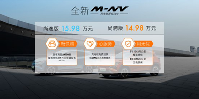 全新M-NV的“三电”系统全面升级。新车搭载基于CTP技术的磷酸铁锂刀片电池,并为电池包配备了装甲式防撞系统,让电池安全性、耐久性大幅提升,同时新增全时域热事故感知系统,24小时守护电池安全,让出行更无忧。