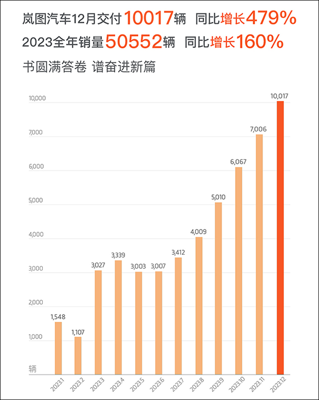在2023年,岚图高速拿下一系列里程碑式业绩。销量突破5万辆,自2023年夏天起月销7连涨,并在12月份首次进入月销过万阵营。