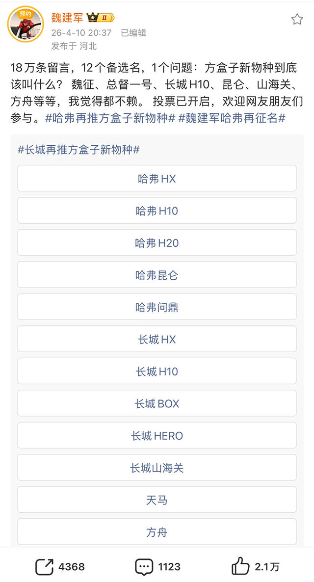 这也是长城哈弗将方盒子旗舰产品最终命名“长城H10”的原因。在长城看来,车型名称的选择从来不止是一个简单标识问题,更关乎企业长期经营布局、品牌资产持续积累,乃至民族产业在全球市场的代表性与话语权,需要站在集团整体战略高度去审视,而非仅停留在字面偏好和一时呼声上。