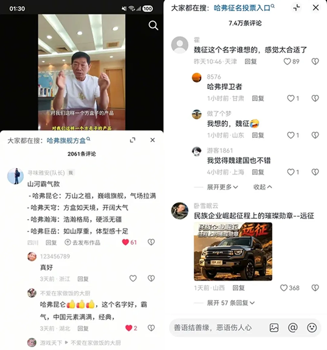 所谓用户运营,在长城这里,举重若轻,大家聚一起琢磨哪个名字上口、易读、寓意好。这款方盒子旗舰,顺理成章变成“团宠”了。“暗号”对上了,产品无须加力预热,很自然地走到台前。网友们主动“认领”这辆车,熟悉得像邻家娃娃。要知道,此时哈弗这款产品细节,还大部分“怀抱琵琶”。这种信任感,恐怕也是魏建军坚持直播的动力之一。