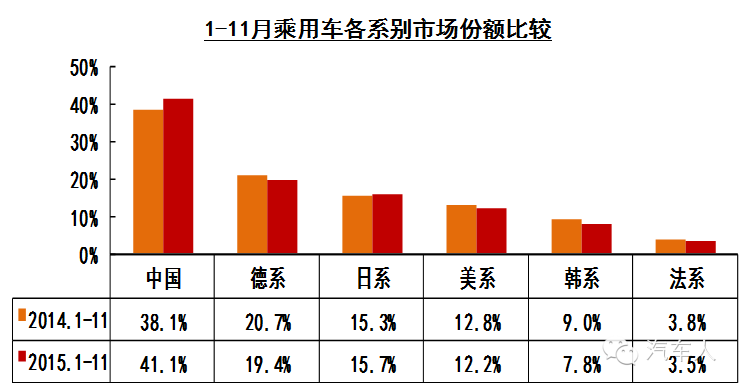 分系别来看,11月,中国品牌乘用车累计销量为92.14万辆,环比增长14.20%,同比增长26.90%,占据乘用车销售总量的41.94%,占有率比上月提升0.29个百分点。1-11月,中国品牌乘用车共销售767.83万辆,同比增长14.12%,占据乘用车销售总量的41.10%,占有率比上年同期提升2.97个百分点。通过深入挖掘SUV、MPV两大细分市场的潜力,中国品牌颇具增长后劲。前11个月,日系市场份额同样抬升,从目前发布的数据来看,丰田、本田、日产、马自达几大日系品牌继续维持上涨势头,其中本田前11个月在华销量更同比增长超过30%。