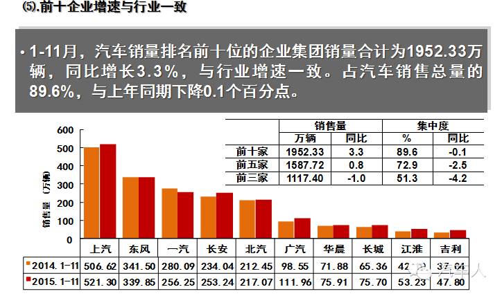 1-11月,汽车销量排名前十位的企业依次是:上汽、东风、一汽、长安、北汽、广汽、华晨、长城、江淮和吉利。上述十大车企累计销量为1952.31万辆,占汽车销售总量的89.61%。与去年同期相比,一汽和东风销量略降,吉利和江淮增速居前。另外,十大车企累计销量同比增长3.3%,与行业增速基本保持一致。