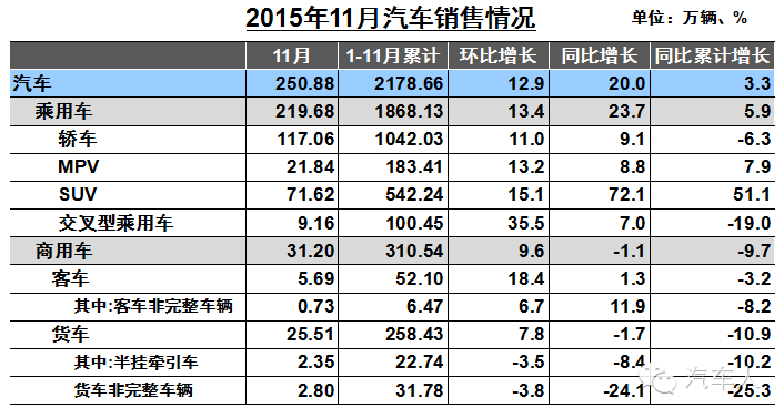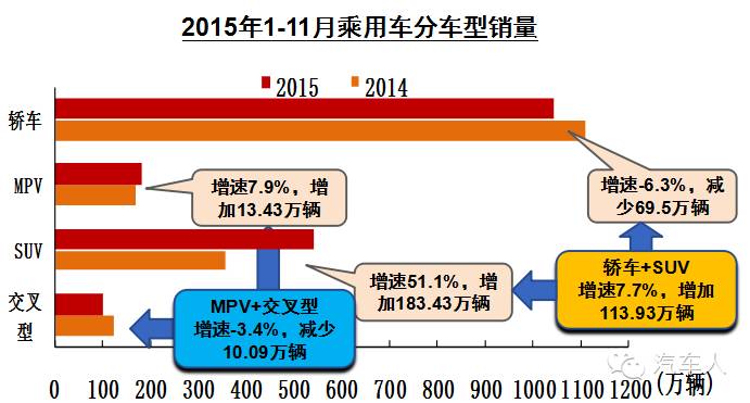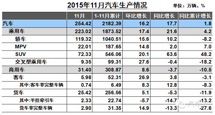 分车型来看,SUV对于乘用车整体市场的增长起到了关键拉动作用,中汽协数据显示,1-11月,SUV产销量同比分别猛增48.2%和51.1%。另外,在经历了去年超过四成以上的迅猛增长之后,MPV回归平稳通道,产销量同比增速分别达到7%和7.9%,随着二胎政策红利的释放,MPV有望成为中国车市下一个掘金点,但提供符合家庭需求的产品仍是关键。相比之下,轿车市场仍显低迷,前11个月,轿车产销量分别下降8.2%和6.3%,车企还需要把握住政策窗口期,针对性完善小排量车型布局。