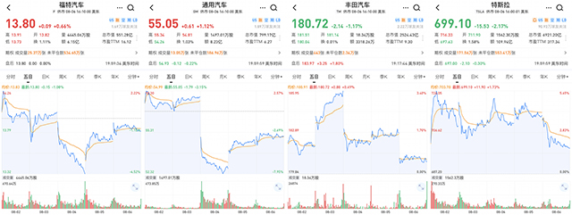 具体到个股,福特汽车周跌1.08%,收于13.80美元,市值551美元;通用汽车周跌3.15%,收于55.05美元,市值799亿美元;丰田汽车周涨0.49%,收于180.72美元,市值2524美元,8月3日丰田盘中创出了186美元的新高;特斯拉周涨1.37%,收于699美元,市值6921亿美元。
